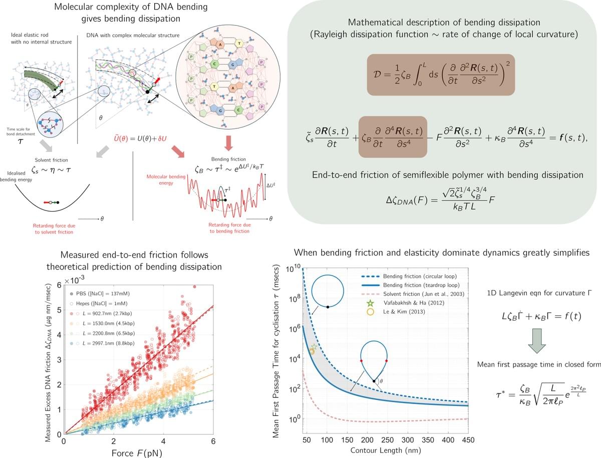DNA bending and looping is crucial for gene expression, packaging, and chromatin organisation. Yet current theories of DNA dynamics based on the semiflexible polymers underestimate empirically measured DNA loop-closure times by a remarkable 1000-fold. We have lacked a basic understanding of what determines how quickly DNA bends? With experimental biophysicist Maxim Moldtsov (Francis Crick Institute and Department of Physics, UCL), we have discovered that for lengths of DNA between 50 nm and 400 nm it is not solvent friction — as semiflexible polymer theories assume — but a new material constant of DNA, the bending friction, that determines how quickly DNA responds to mechanical forces. We determine this new material constant of DNA — from single molecule stretching experiments using optical tweezers — to be ζB = 241±17 μg/msec and strikingly independent of changing salt concentration (unlike the bending elasticity). This reveals a new picture of DNA mechanics at these length scales: rather than an ideal elastic rod, DNA is a viscoelastic polymer with a locally complex energy landscape for bending with dramatically slower dynamics. This is a fundamental discovery on par with establishing DNA’s elastic properties, which are well-described by the Worm-Like Chain model. While the bending elasticity has been profoundly influential, it is likely that bending friction and the Dissipative WLC (DWLC) model will be even more so: molecular biology is inherently out-of-equilibrium. This work has established a new foundation for DNA dynamics: any biological process involving DNA looping — from the action of molecular machines to chromosome organisation —